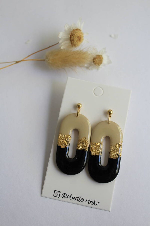Prachtige statement oorbel in een unieke kleurencombinatie van zand, zwart en bladgoud! Leuk voor de feestdagen maar natuurlijk ook om je alledaagse outfit een speciale touch te geven.
