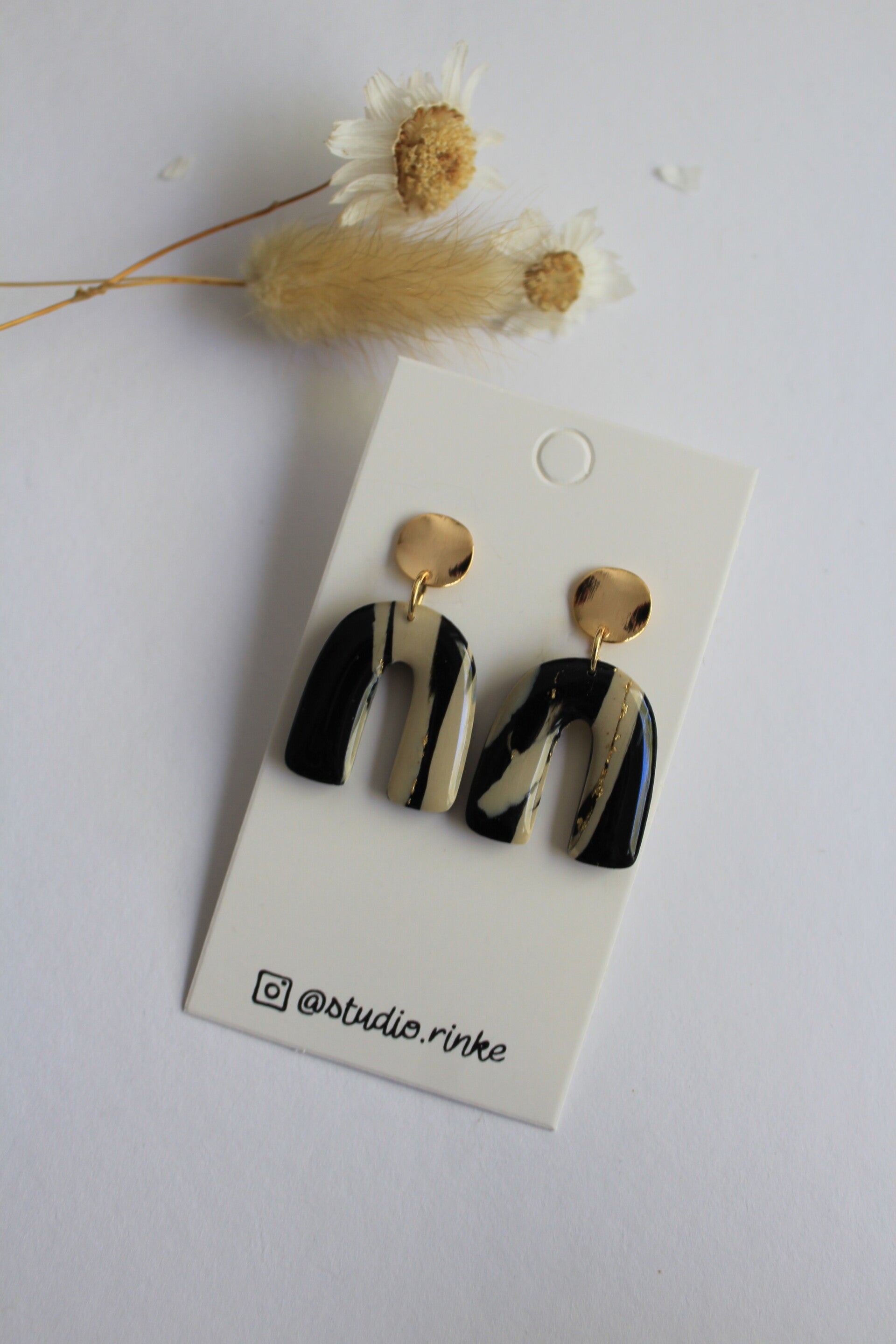 Prachtige statement oorbel in een unieke kleurencombinatie van gemarmerd zand, zwart en subtiel wat bladgoud!